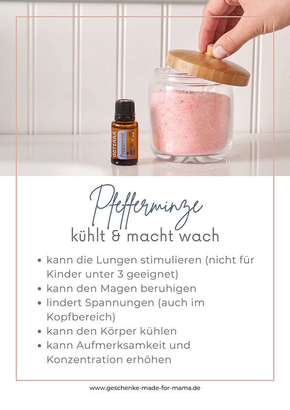 Bei Kindern unter 6 Jahren sollte Peppermint-Öl nur stark verdünnt und sehr vorsichtig angewendet werden. Für Kleinkinder unter 3 Jahren und Babys ist es nicht geeignet. Eine gute Alternative für Kinder ist die doTERRA Kids Collection. Mehr lesen: Ätherische Öle für Kinder I Blog Geschenke made for Mama